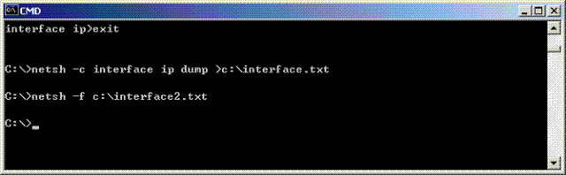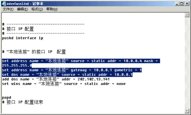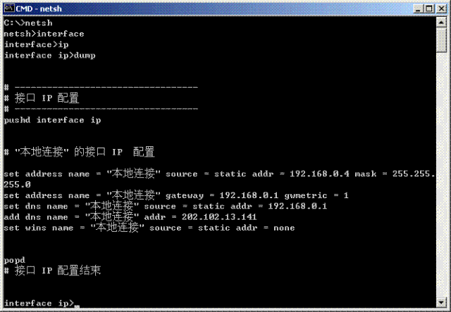 而通過netsh -c interface ip dump >c:interface.txt的方式可以導(dǎo)出配置腳本。